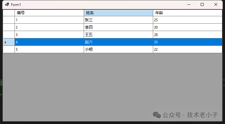 dataGridView1.Rows.Add(4"赵六"35);