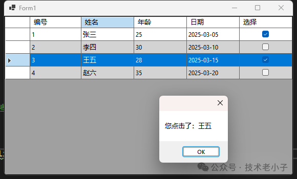 dataGridView1.Rows.Add(4"赵六"35, DateTime.Now.AddDays(5), false);