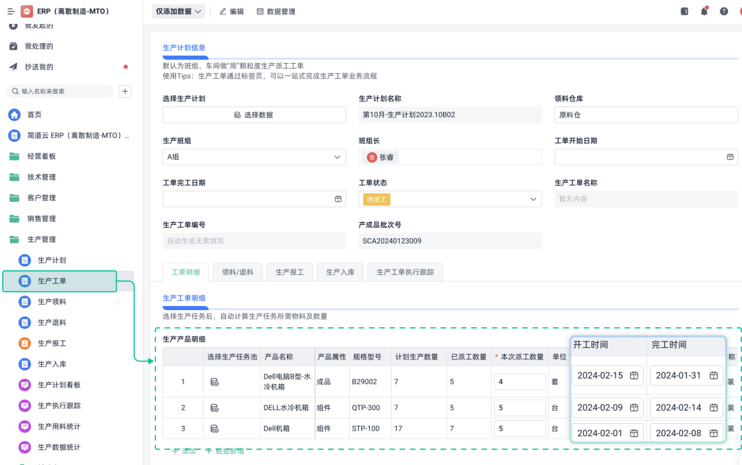 • 给每张工单分配起止时间、所需资源。