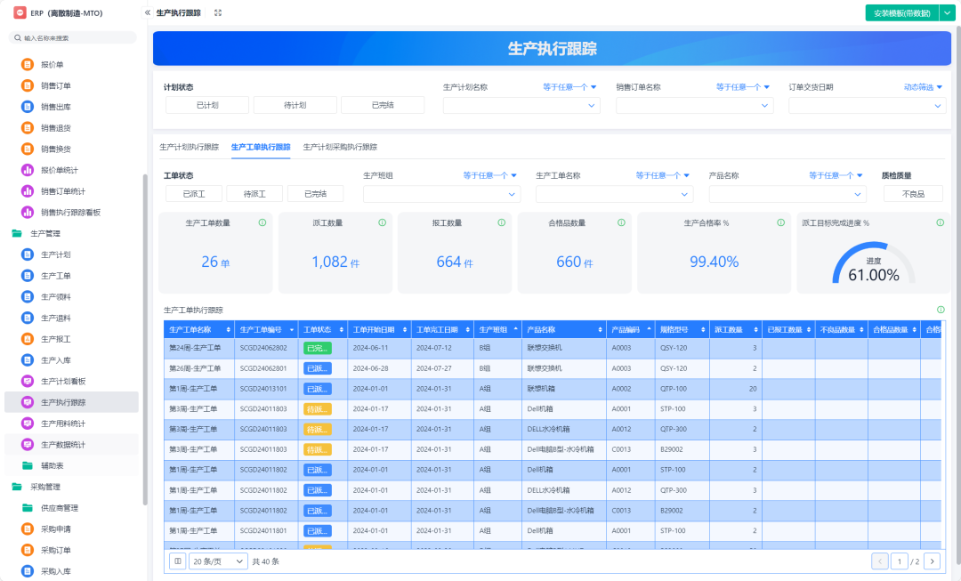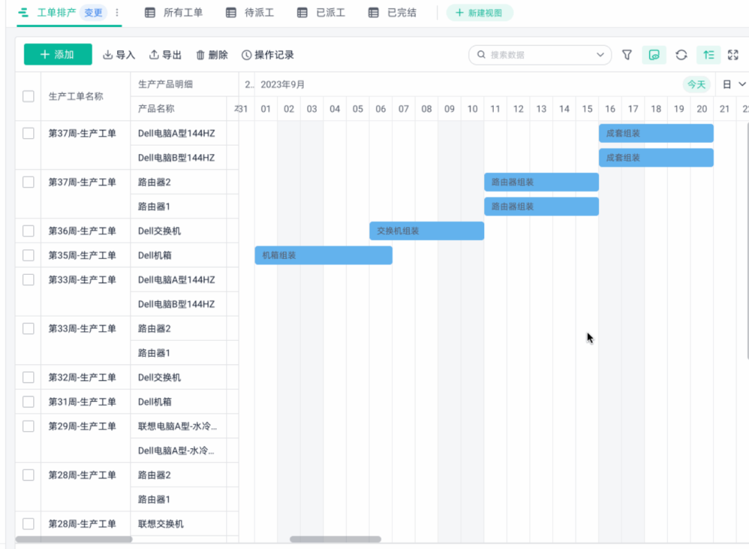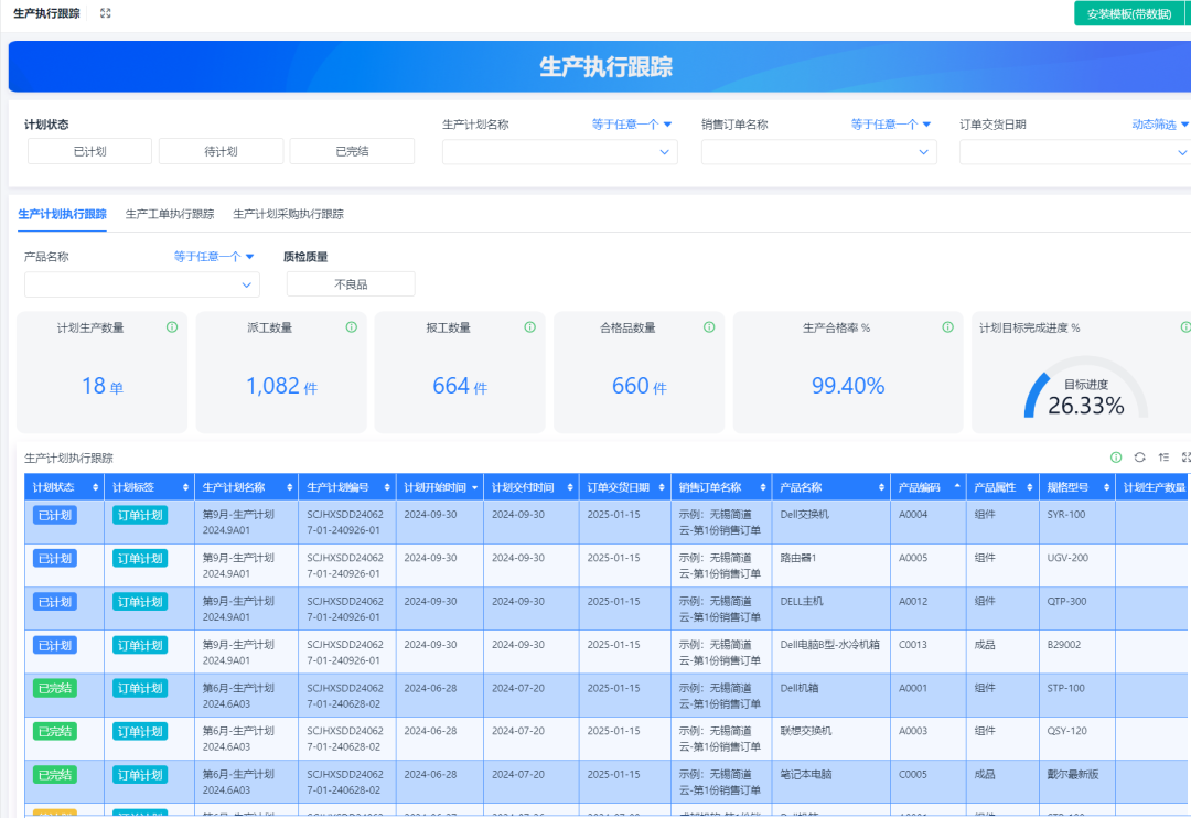 • 每天根据工单执行进度录入系统:完工数量、是否延迟、物料到齐没;