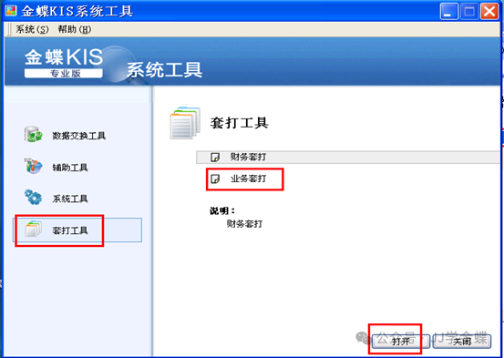 在“开始 - 所有程序 - kis 专业版 - 系统工具”处点击系统工具,打开“金蝶 kis 系统工具 - 套打工具 - 业务套打 - 打开”,这时系统会跳出一个跟平常一样的登陆对话框,登陆到你要套打单据的帐套。不同的是,点击确定后,系统这时打开的是 kis 套打设计器。