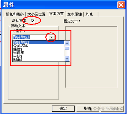 2. 双击活动文本“购货单位$”,出现如下右图,里面的内容是从关键字里选择的,打印出来的内容是从单据上取的。