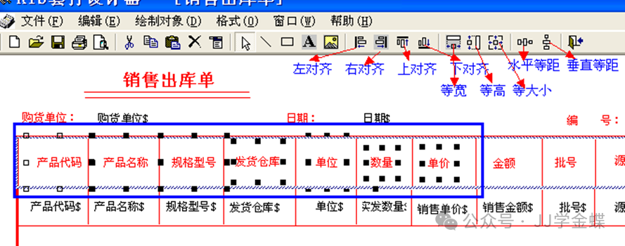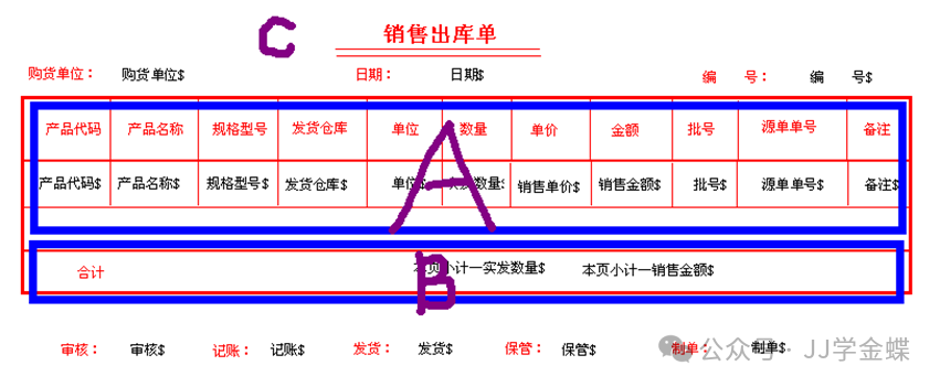 A. 不带 $ 符号的,我们称为固定文本,比如说上图中的销售出库单。他们的实质是打印时,不同的单据这个位置始终是这个字眼。