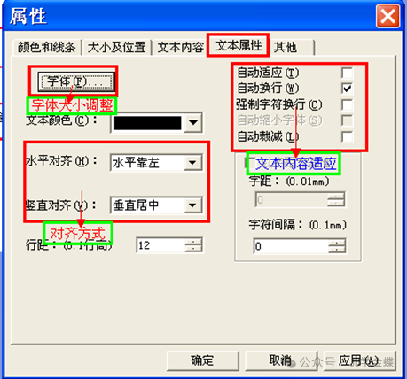 B. 双击文本框,在文本属性页面可调整字体大小、对齐方式、文本适应方式等。