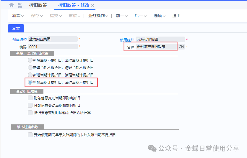 2.在【固定资产】→【折旧政策】中新增无形资产折旧政策:新增当期计提折旧,清理当期不提折旧;