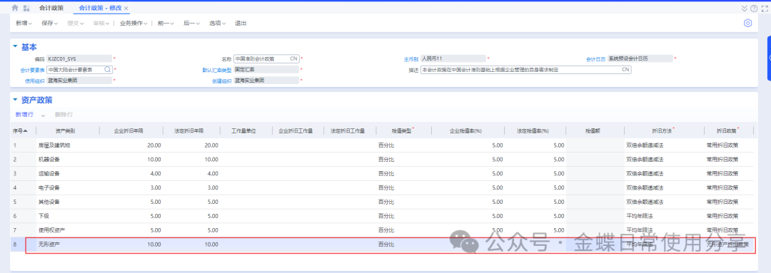3.打开【固定资产】→【会计政策】,在【资产政策】页签新增行,资产类别选择“无形资产“,折旧政策选择”无形资产的折旧政策“。