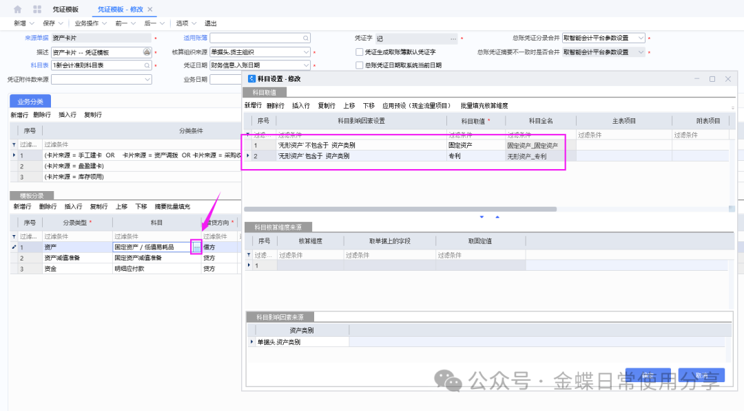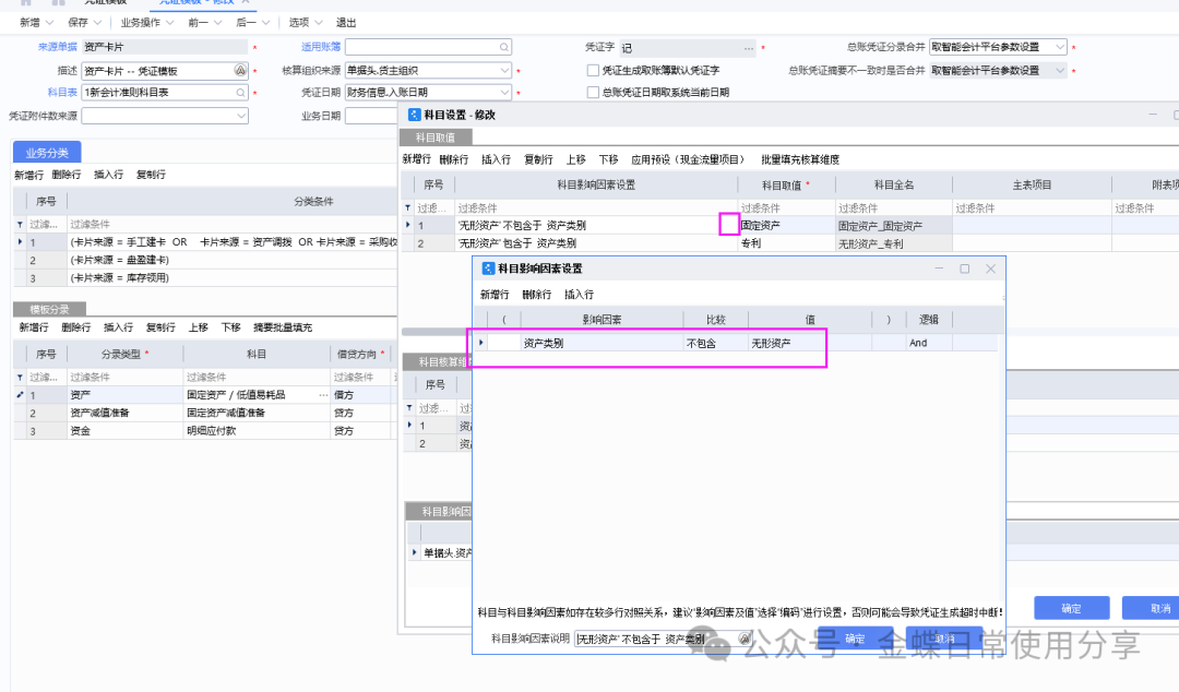 5、资产卡片和折旧调整单的凭证模板需要按照资产类别区分设置一下。