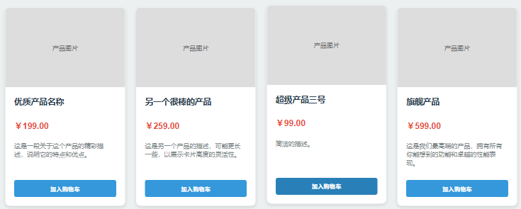 <div class="product-card"> <div class="product-image">产品图片</div> <div class="product-info"> <h3 class="product-title">另一个很棒的产品</h3> <p class="product-price">¥259.00</p> <p class="product-description">这是另一个产品的描述,可能更长一些,以展示卡片高度的灵活性。</p> <button class="add-to-cart-btn">加入购物车</button> </div> </div>