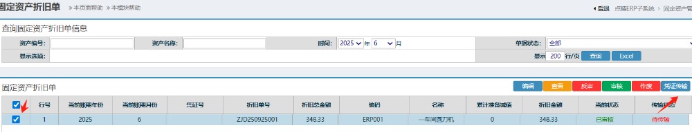 勾选上要转凭证的折旧单,然后再点击凭证传输按钮