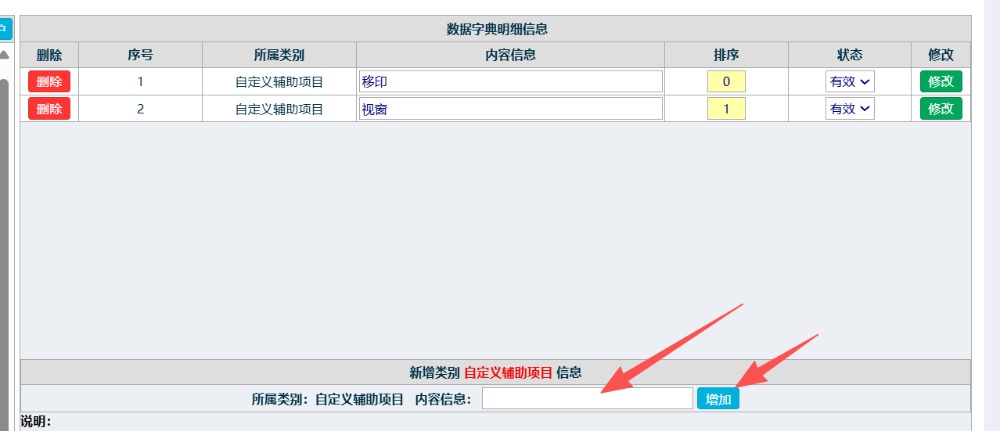 ![]() ![]() 操作步骤:ERP-系统管理-数据字典维护,如下图: 进入界面后,点击“自定义辅助项目” 输入自定义的项目内容,点击添加即可,如下图所示: ![]() 点晴模切ERP更多信息:http://moqie.clicksun.cn,联系电话:4001861886 该文章在 2025/10/11 16:32:48 编辑过 |
