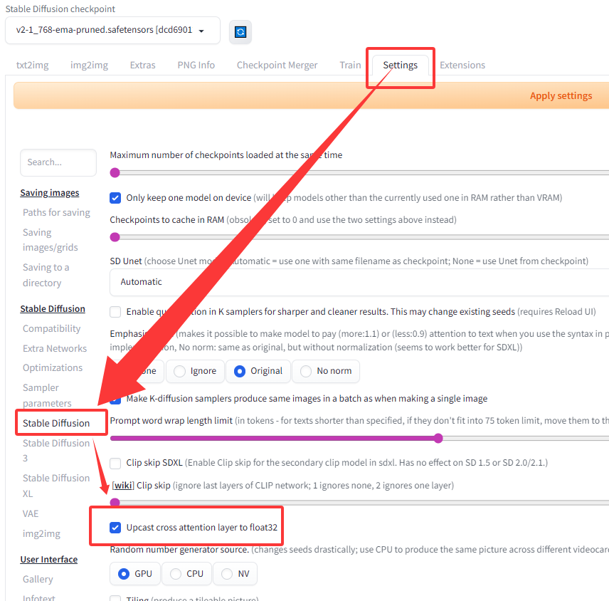 2. 在左侧菜单,点击 Stable Diffusion 子菜单。(就是你之前找到 "Upcast" 选项的那个地方)。