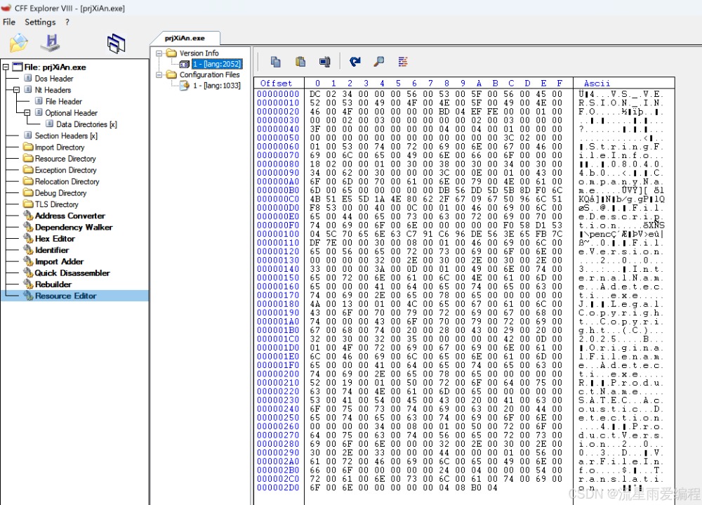 1.功能介绍CFF Explorer 是一款专为 Windows PE 文件(如 EXE、DLL、SYS)设计的多功能工具,核心功能包括深度结构分析、可视化编辑和逆向工程辅助。它由 Daniel Pistelli 开发,支持 PE32/PE64 格式,提供图形化界面和脚本扩展,广泛应用于软件调试、恶意代码分析、资源修改等场景。 1.PE 文件深度解析结构可视化:直观展示 PE 文件的 DOS 头、NT 头、节表、导入表、导出表、资源节等核心组件,支持字段级编辑。 高级分析: