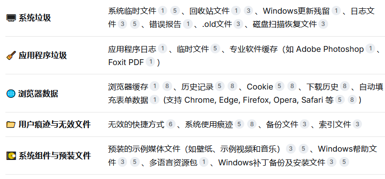 自动扫系统临时文件、浏览器缓存、回收站残留,Chrome/Firefox/Edge 的痕迹全清,保护隐私又省空间。小白一键搞定。