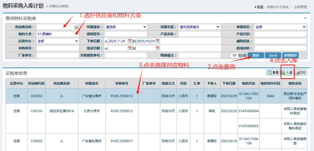 2.进入页面后,按图操作:选好供应商和物料大类,点击查询。然后点击选择对应物料,点击入库