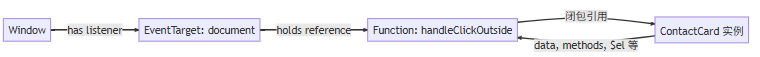 我们有个客户信息管理系统,允许用户动态添加“联系人卡片”。每张卡片都监听全局点击来关闭自己: