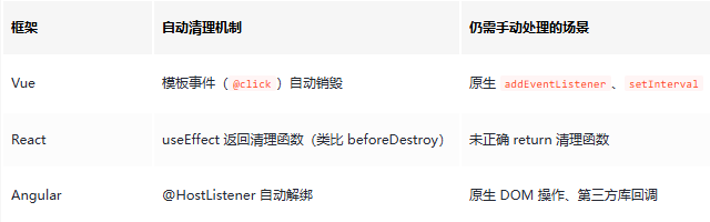 记住:框架只能管“它知道的”事件。一旦你走出框架封装,进入原生 API,责任就回到开发者身上。