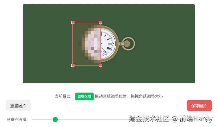 • resize-handle:区域调整关键:4 个角的手柄(nw/ne/sw/se),分别对应 “西北 / 东北 / 西南 / 东南” 方向缩放,解决 “马赛克区域大小不合适” 的问题,提升灵活性