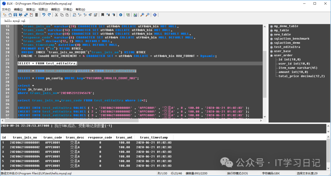 打开.sql文件,根据文件头配置自动连接上数据库,右侧树控件中自动列出所有能访问的表、以及表字段清单,选择SQL按F5直接提交数据库执行