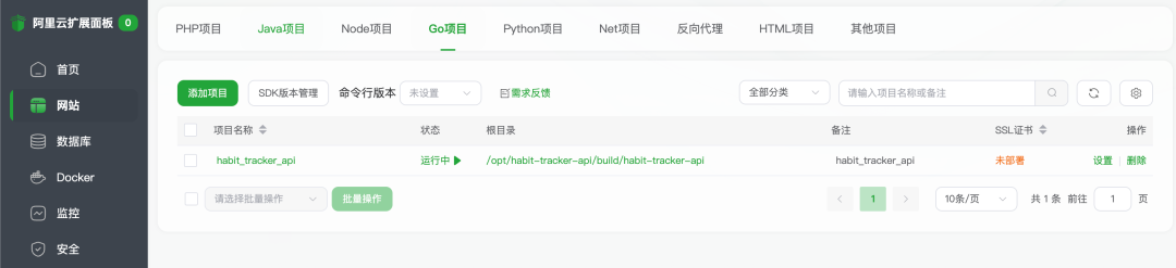 第一步先来配置 API 的应用,以下是运行中的 go 写的 API 站点,下图可见,应用已启动。项目的端口用的是 8080。
