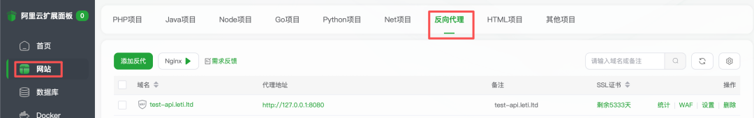 左侧菜单选择网站,选择反向代理标签 → 点击「添加反向代理」。