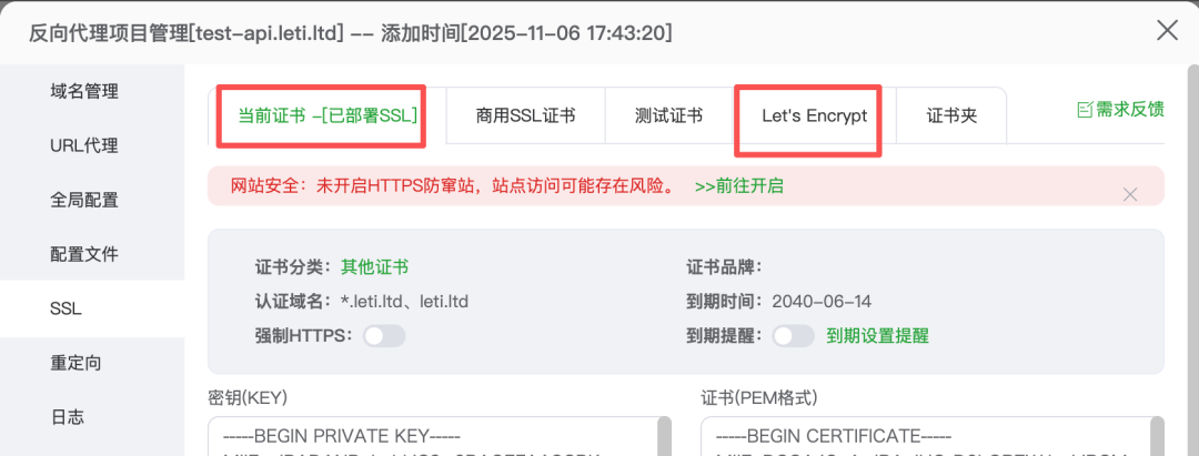 保存完以后,可以设置 SSL 证书。配置有多种方式,如果你已经有证书的话,可以输入密钥(key),证书(PEM 格式),保存。也可以申请免费的证书 Let's Encrypt。