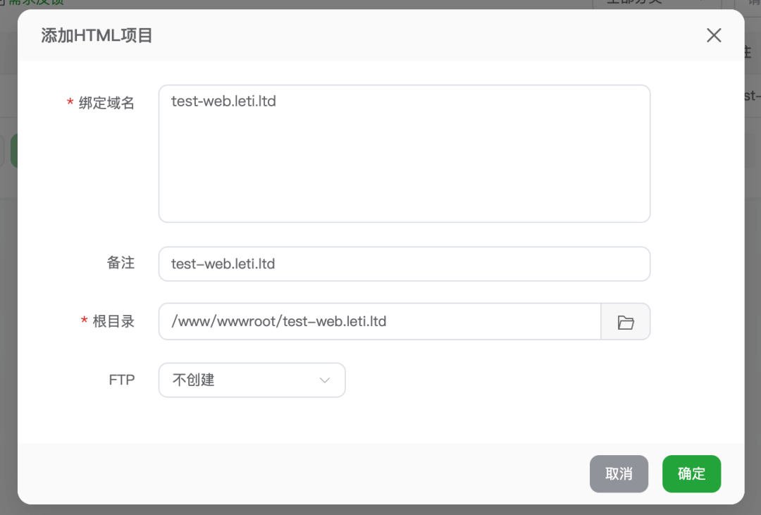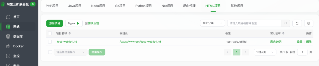 添加一个HTML 项目,这里解释下由于 HTML 项目和反代理用的是同一个Nginx,这里配置好以后,不需要在反代理那边再配置,底层操作的是同一个 Nginx。