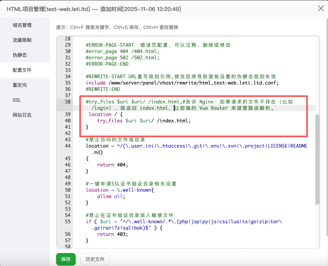 解决方法:配置 Nginx 的 try_files,在你的 Nginx 配置文件中,找到前端项目的站点配置,增加以下内容: